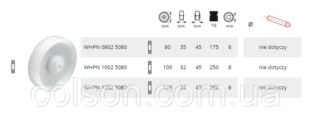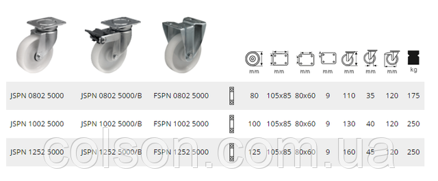 Поліамідне колесо з одним підшипником. Серія для інтенсивного використання характеризується обертовою вилкою глибокої витяжки оцинкованої сталі й обертовою головкою з герметизованим прецизійним кульковим підшипником. Виделки цієї серії з підшипником у поворотній головці, що неабияк подовжує термін експлуатації системи. Кріплення серії інтенсивного використання має бути встановлене на плоскій поверхні (монтажній пластині). Робоча температура: -20 °C/+80 °C Протектор твердість 75° за Шором D.